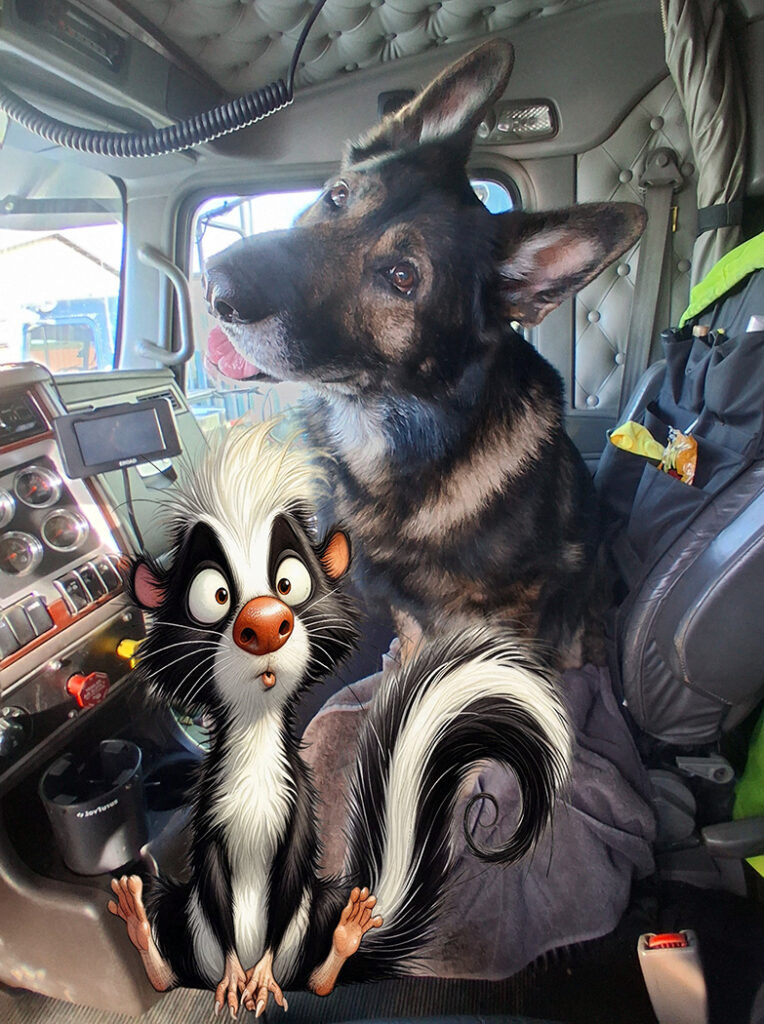 I’m mortified as we walk back to the truck, my clean coat still dripping, that I might be seen by another trucking dog and the shame shall never leave me. I myself have had a glorious time teasing and mocking small trucking dogs who smell like blueberries with hilarious little pink bows cemented to their ears. Am I to end up like them? Unhooking the truck keys that live on the belt loop of his jeans, my driver once again smiles at me. An almost evil grin filled with the look of conquest. The smug satisfaction on his face is basically the same look he got smoking that Peterbilt on Cabbage Hill in Oregon last spring.