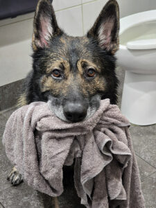 Looking inside, I can’t get enough traction on the slippery hallway floor as I attempt to flee from the room. My collar, leash, and driver thwart any attempt I make to get past the rolling cart, and I am surreptitiously pulled into the room by my soon-to-be ex-driver, as loyalty only goes so far when faced with the horrors of this shower dungeon.
