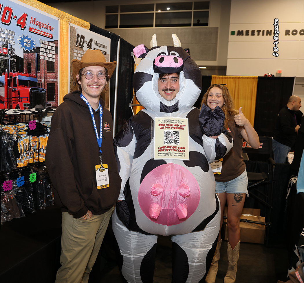 This year, we were still promoting our upcoming Trucker Rodeo event, so we brought out some extra things and had some fun with it. Our newest skills competition added this year was the “Heavy Equipment Loading” contest, so we brought and displayed the “heavy equipment” that was to be used in that competition – two John Deere pedal tractors. Those little green and yellow tractors were very popular, and several people took pictures of their kids (or themselves) on them! We also dressed Kenan up in an inflatable cow costume and sent him and Parker out to walk the show, hand out fliers, and take pictures with fellow vendors and attendees. And, of course, a few “Betsy” cows made an appearance, too. It was a lot of fun.