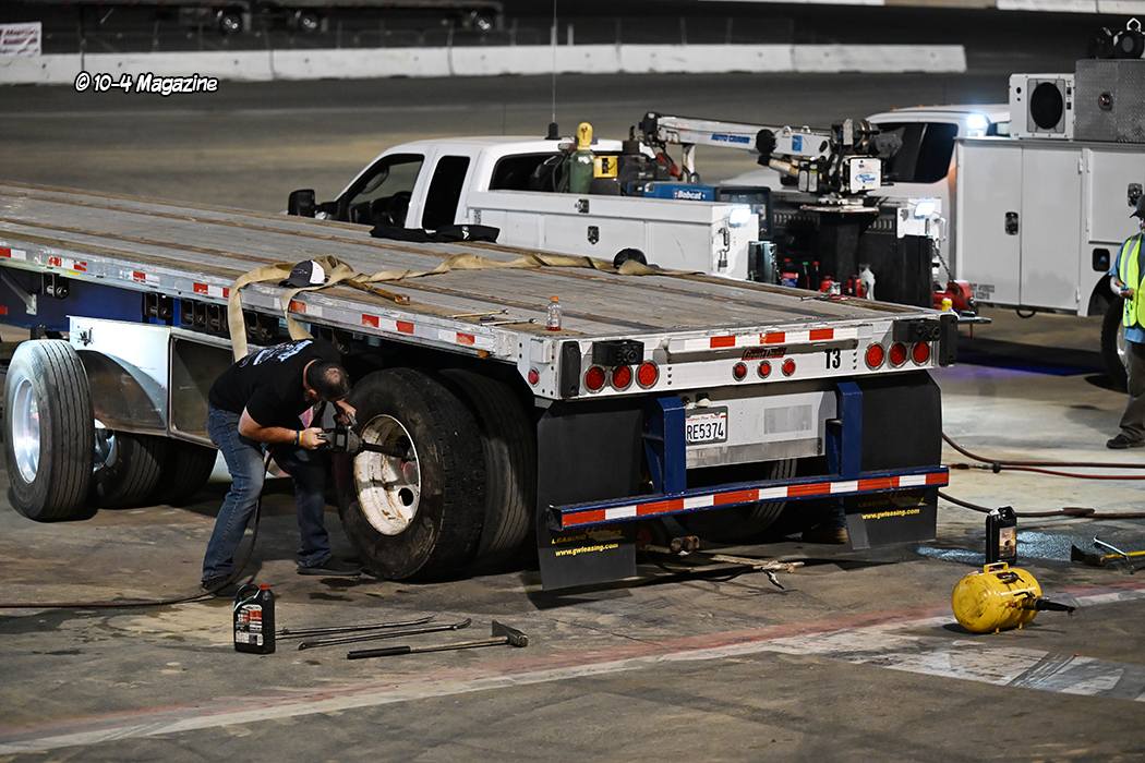 Kern Raceway is a great facility, sitting on 125 acres, with a high-banked half-mile oval racetrack and grandstand seating (and luxury suites) for thousands of fans.  There is even a tunnel going to the track’s infield, which is where all the trucker skills competitions are held.  And with 12 events including four classes of backing, a transfer dump competition, equipment loading, tire changing, loudest stereo, cow loading, hay loading and unloading with a squeeze and a boom, and a burnout contest, we were very busy both days – but especially Saturday.  Competitions began at around 11:00 AM Saturday morning and didn’t finish until about 7:00 PM that night.