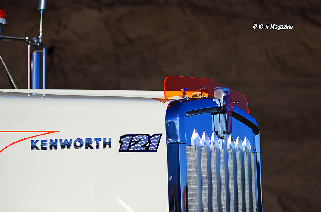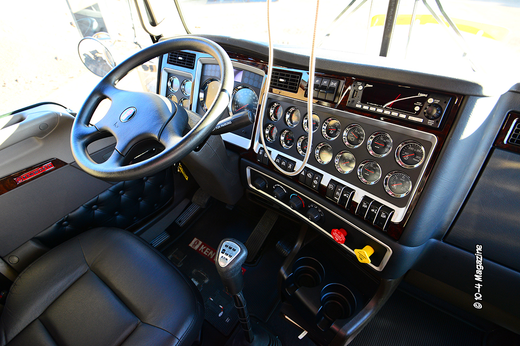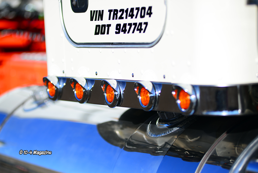 Painted Pearl White and Flame Orange, the flat-glass Kenworth, with a 42-inch flattop sleeper, has a decidedly retro vibe. Referencing many of the West Coast cool factors from the 70s, 80s and 90s, the truck features a color-matched Nelson bug shield, Hogebuilt stainless fenders on blind mount brackets from 4 State Trucks, T-Kane hub covers, and stainless cab and sleeper light panels featuring 2-inch round lights. With lots of custom lettering, pinstriping and art along the entire truck and trailer from Cassie Evancich of Cassie Custom Art, the combo has a distinctive retro touch. Upgraded to a Seattle package interior, the truck is kept clean and understated, with the bunk spec’d for Georgia and Cash, Shawn and Brittney’s two kids, for when they ride with dad.