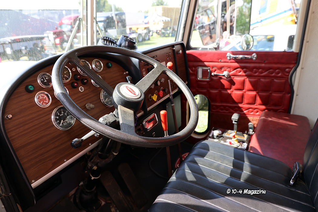 Pulling the blown motor and the 18-speed transmission Siller Bros. had put behind the CAT engine, Lee found and bought a 400 Cummins out of a 1975 Kenworth and then installed a two-stick 6+4 setup in the truck.  Wanting the old vocational Peterbilt to ride smoother, he bought a single-axle air-ride cutoff from a 2016 Peterbilt and replaced the stiff dual axle rear spring suspension the truck originally came with.  The wheelbase was extended a bit, but the overall length of the truck remained the same.  He then bought and installed a 20-foot Morgan flatbed, that might allow him to one day haul a car or a golf cart, but it also added weight to rear of the truck, which made it ride even better.  After a fresh paint job in the Siller colors but with a slightly different scheme, the truck was ready to enjoy and take to some shows.