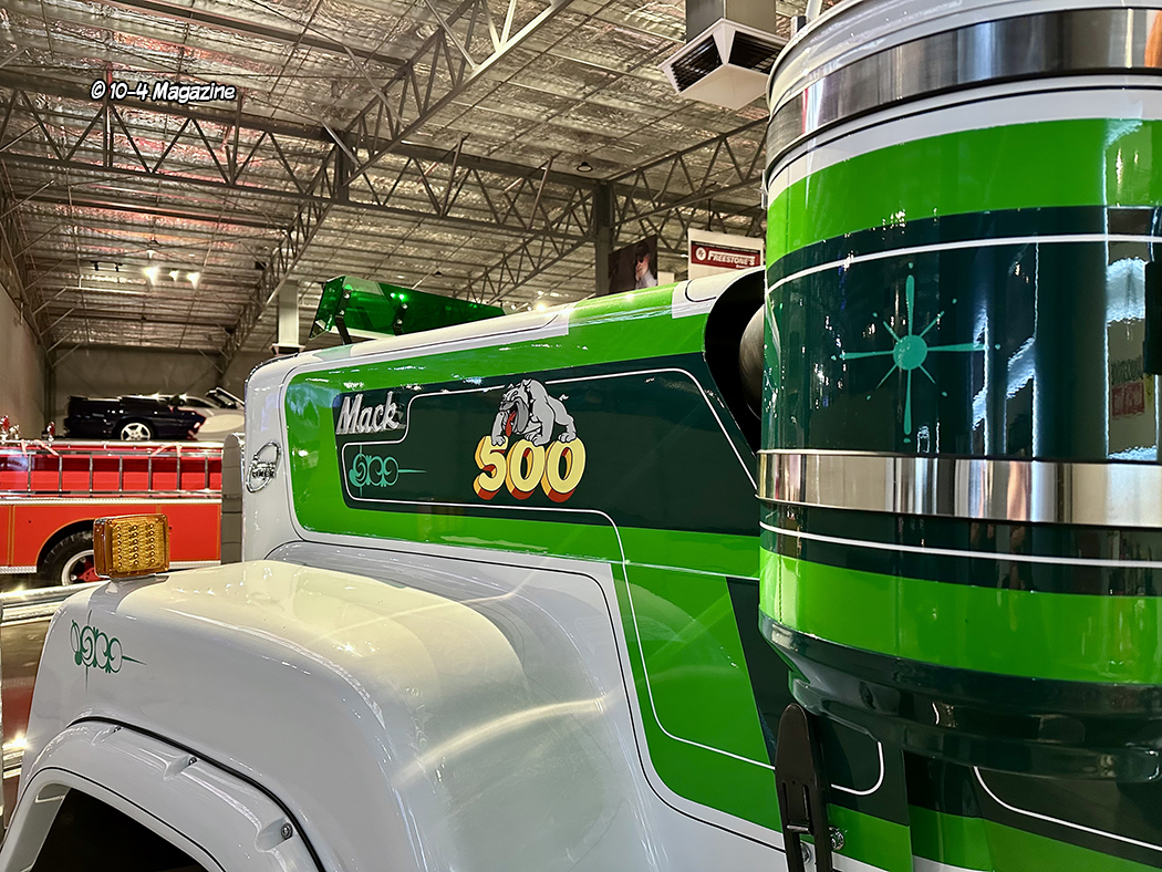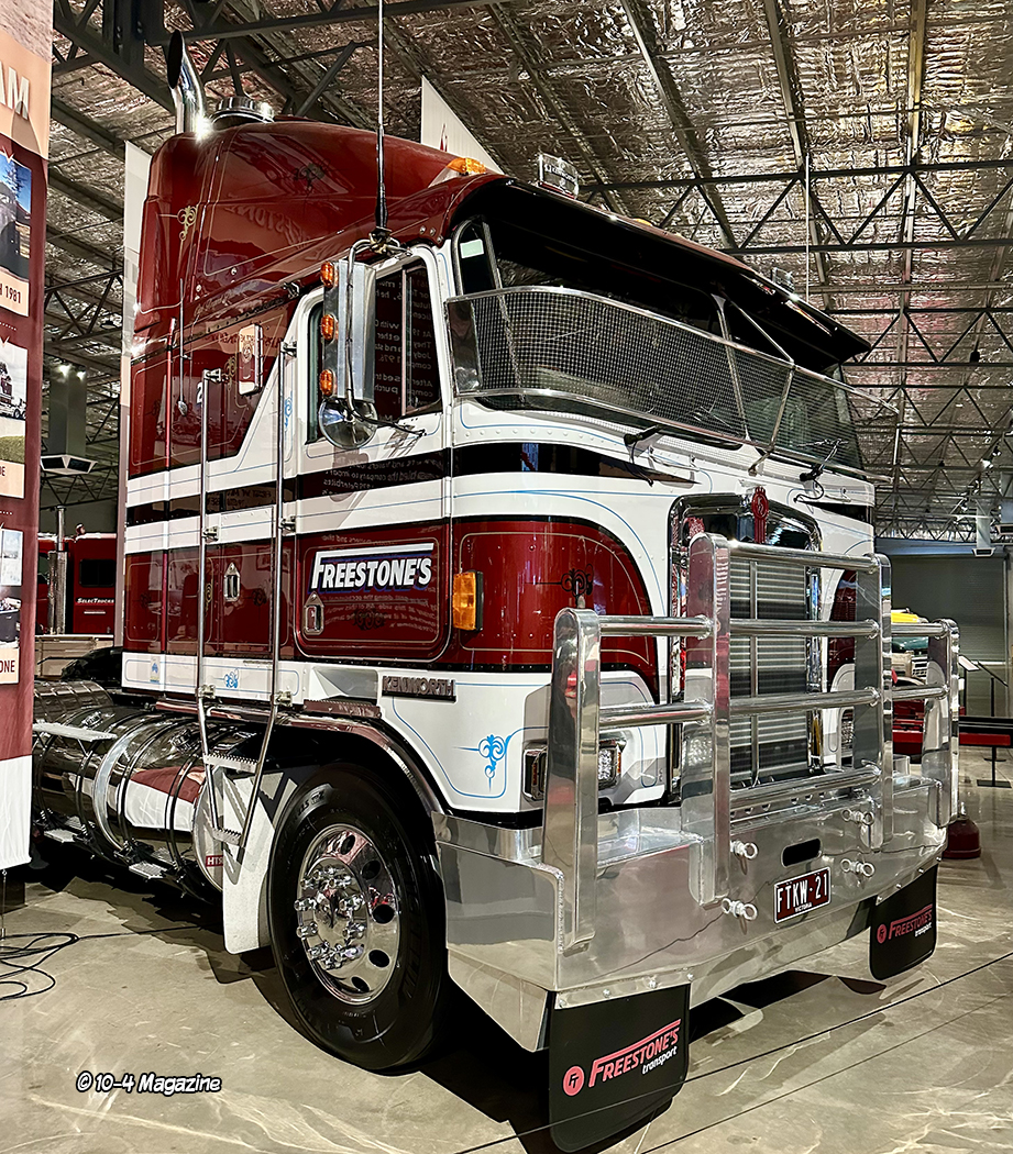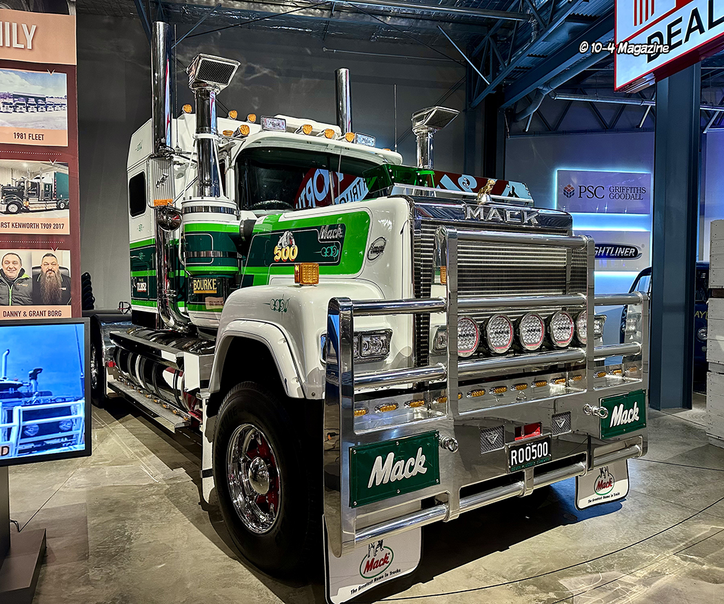 A 1988 Mack SuperLiner greets visitors to the pavilion. Next to the truck, a TV screen shows why it gets to be front and center. The truck became a Guinness World Record holder in 1994 when it pulled 29 trailers, with 28 converter dollies, pulling 500 tons, or 1 million pounds! Kevin “Plugger” Bowden drove the setup through the town of Bourke. A painted bulldog with “500” adorns the side of the hood and commemorates the feat accomplished by the white and green V8 powered Mack.
