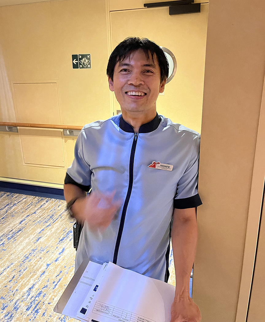 On the very first day, Hans had memorized all our names and the names of every passenger in his group of rooms. If that wasn’t enough, he also knew us on sight and called us by name, even the children. You might ask why that is important. He said that after 27 years of service, he had learned children come and go to the pool often, so they need extra towels and personal items. There is limited storage space in the rooms, so he needed to stock and restock these as needed. It’s all about logistics – having the right thing when you need it, even if you didn’t know you were going to.