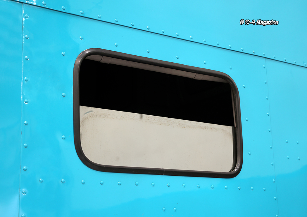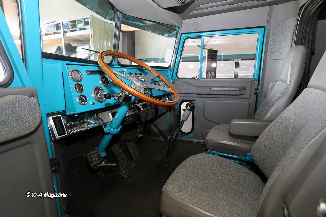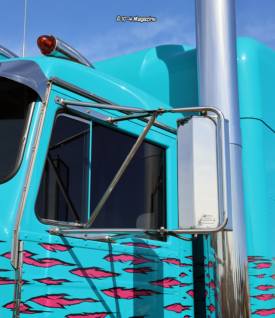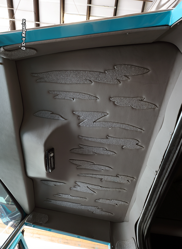 Moving inside, Stan took two square door cab dashes and built one custom “hot rod” dash, installed a vintage A/C unit from a street rod, and polished the door hinges (back then he did most of his own polishing). The entire truck was rewired using a harness from a Peterbilt 379, and then Howdy Ledbetter of Interiors by Howdy did the inside in tweed and leather, embossing the exterior’s “ripped” scheme graphics into the headliner. The interior has a definite 1990s vibe, for sure! Last but not least, Stan made the window in the back of the cab roll up and down, and claims he was the first ever to do that.