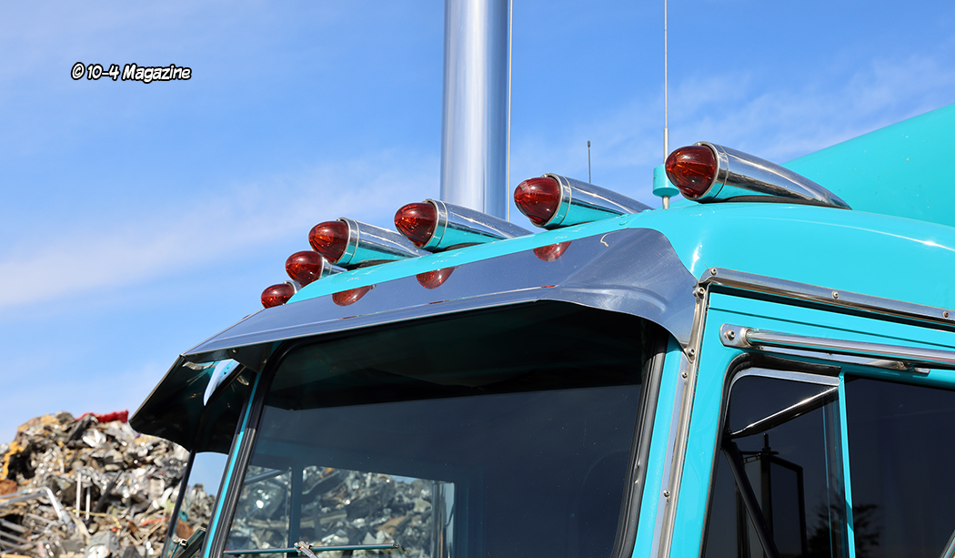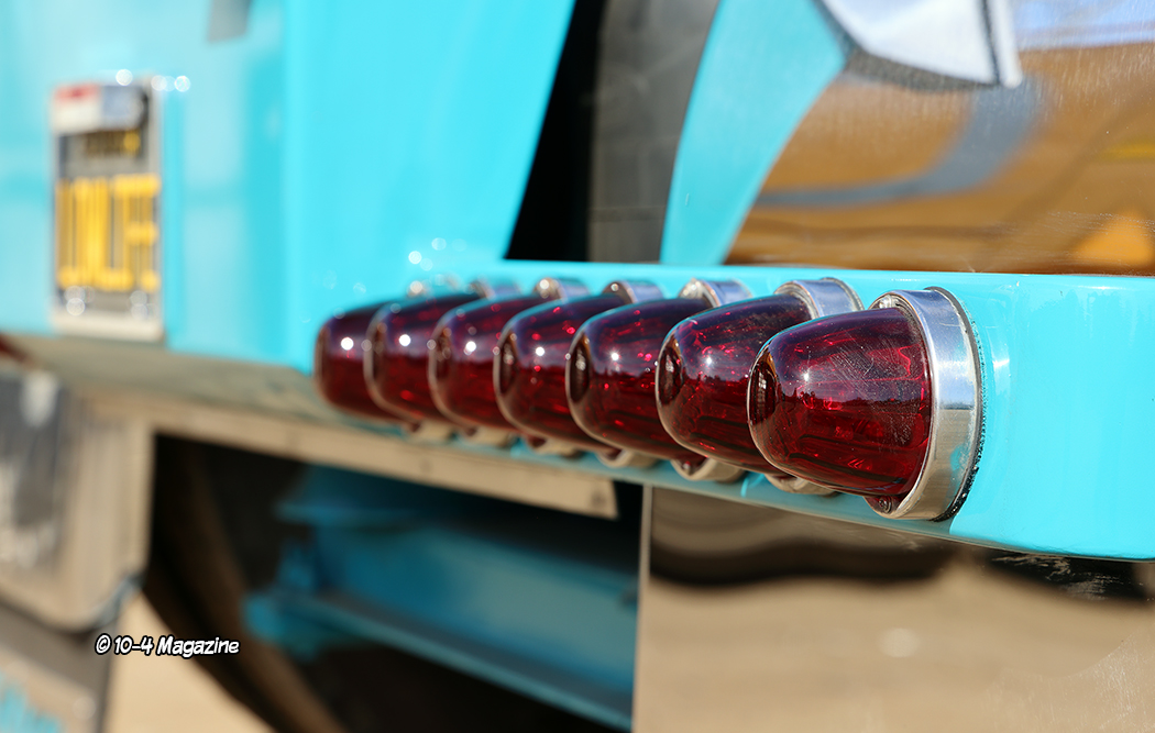 Some of the other unique exterior items this truck has includes an 18” stainless bumper with rolled ends made in-house, battery and step boxes from the mid-1980s with custom lids made by Stan, and 135-gallon 26-inch diameter fuel tanks, also made in-house, with one of them being split to hold the hydraulic fluid for the wet kit to run their end dump. The hot rod rig also got Hogebuilt stainless full fenders on steel brackets, a custom light bar on the back featuring seven lights with glass watermelon lenses and custom billet bases on each side, and a polished stainless steel deck plate, all made by Stan.