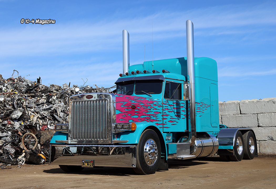 Building his house in 1990 just down the street from the yard, Stan still lives there today. In 2005, Stan got married to Tammy, who he had known since high school. She has a son named Clayton (30) and a daughter named Macy (26). Stan also has three grandkids he adores, with one of them being little Stan Silva IV. At their house, the same place where he built his hot rod Peterbilt featured here, they have some toys that include a turquoise 1933 three-window Ford coupe, a purple 1955 Chevy Bel Air, which was his dad’s car, a custom turquoise 2016 rock crawler Jeep, which was purchased as a salvage after it was stolen and stripped when new, and a “Tonka” truck, which is a turquoise 2019 International with a 4-door crew cab. This truck was destined to be a fire truck, but on its way to be delivered, it, along with three others, rolled over in a wreck (Stan bought two of them). Stan actually uses this truck on occasion to haul small pieces of equipment to remote areas in the mountains – but it’s mostly just for fun.