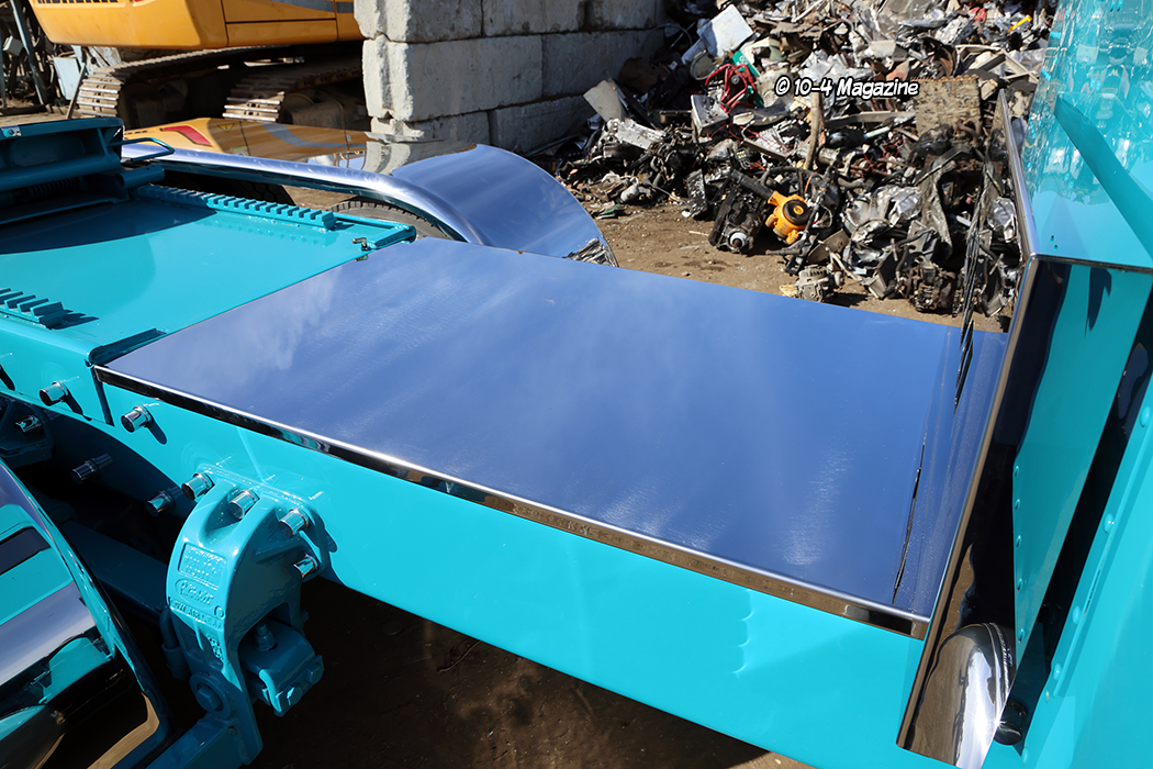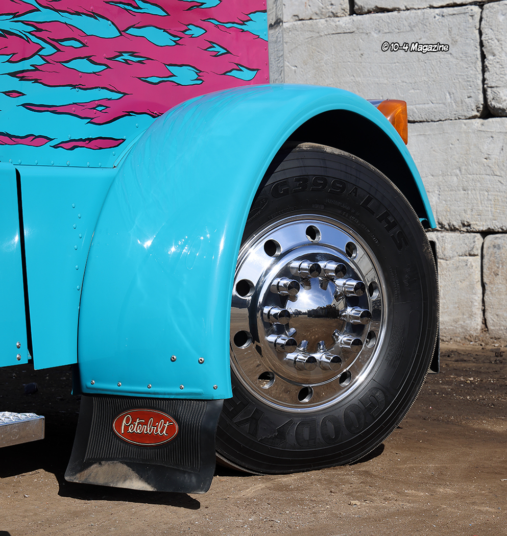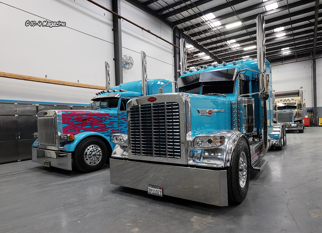When Peterbilt announced the end of the model 389, Stan figured it was time to get a new personal truck for himself, even though he doesn’t go trucking very often, and also one for his son. Ordering matching 2024 Peterbilt 389X trucks, one in turquoise and the other in metallic gray, the trucks have sequential VIN numbers but were built a month apart. Equipped with 605-hp Cummins engines, 18-speed transmissions, 3.36 rears, and 280-inch wheelbases, each truck has a standup sleeper and a high-roof cab. Since taking delivery of the trucks, they have built and installed custom bumpers, visors, boxes and lids, fuel tanks, fender brackets, deck plates, mirror brackets, and a host of other unique pieces. Besides the stacks from Pypes and the stainless steel rear fenders from Hogebuilt, the guys built everything else, right there in their shop.