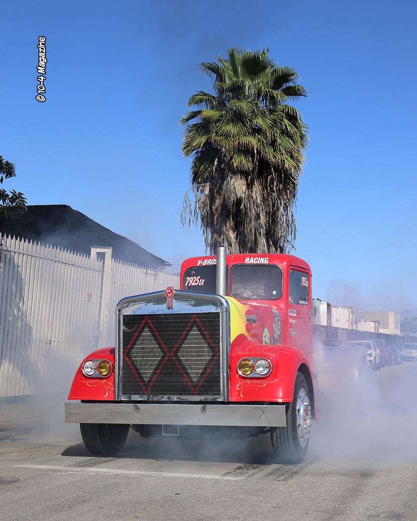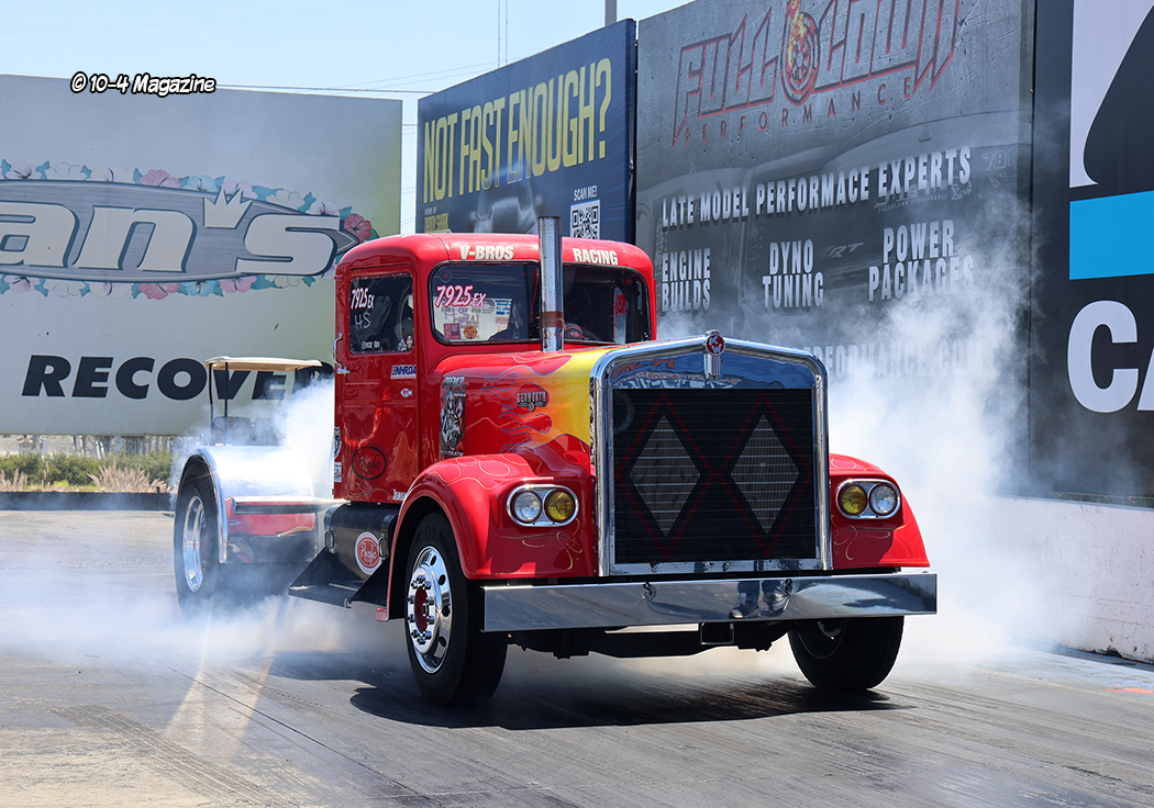 By September 2019, the V-Bros had what resembled a drag race truck.  Getting close to the October date of TFK, their goal was to finally have their race truck on the track.  When race day finally arrived, the truck was not painted, and they needed help hauling it to the races.  Their friend, Ryan Rodriguez, offered to haul the KW race truck to TFK with his 1950 Kenworth.  Running nowhere near as fast as they do today, these rookies still had huge smiles on their faces, and V-Bros Racing was born.  Living pretty close to Irwindale Speedway, it was common to see the KW “testing and tuning” on the track every Thursday night.  With lots of experimenting, trying to prove the Detroit powered racers wrong, they were determined to make that Big Cam Cummins run fast.