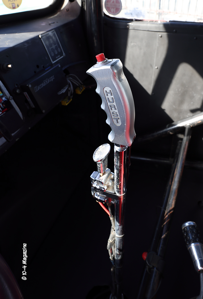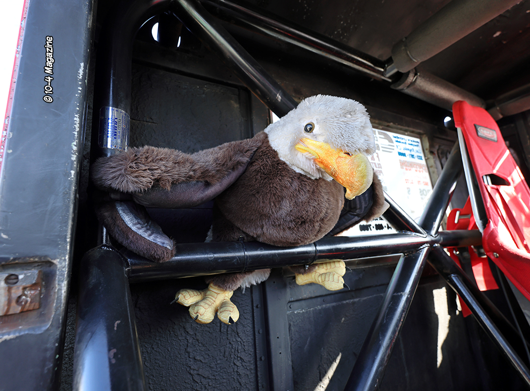 Inside the truck, you won’t find a lot of fancy gadgets or creature comforts – just the bare minimum of what is needed to go fast!  There is only one seat, which is surrounded by a full NHRA-approved roll cage, just a handful of gauges, old style glitter toggle switches, and a removable steering wheel.  The truck is equipped with a Computech DataMaxx data logging system that records everything about the truck – and I mean everything – during a pass.  It records what is happening in every cylinder, along with all the other important data points, inside and outside air temperatures, everything.  All this information goes onto an SD card that can be removed and then put into a computer to be viewed and analyzed.  This data is invaluable when honing your craft and dialing in your machine!  One other interior “feature” is the co-pilot, “Bob” the eagle (most racers have a mascot inside that goes along for the ride).