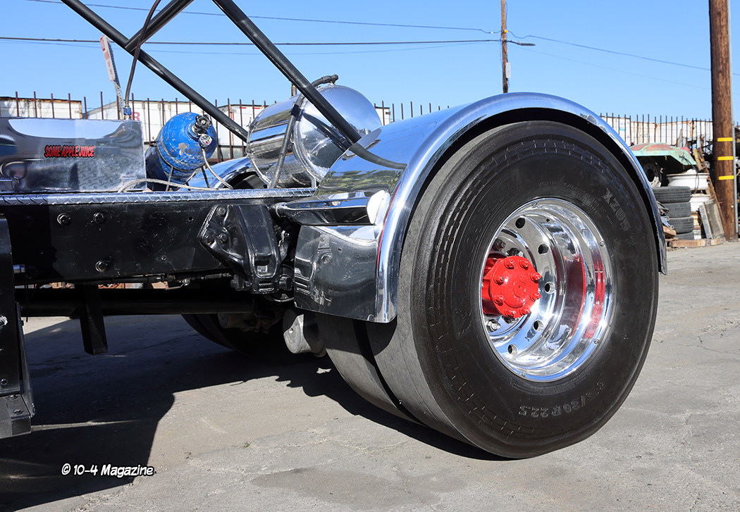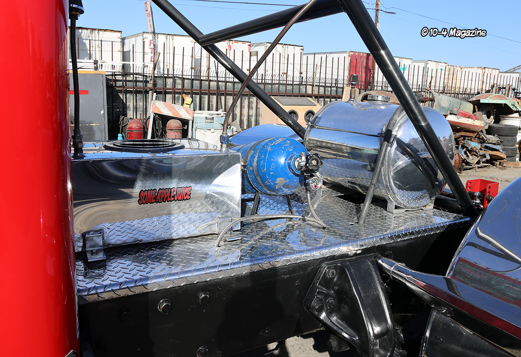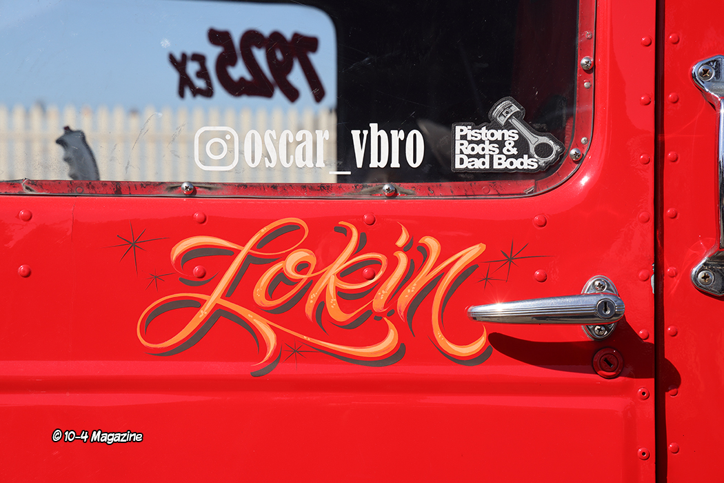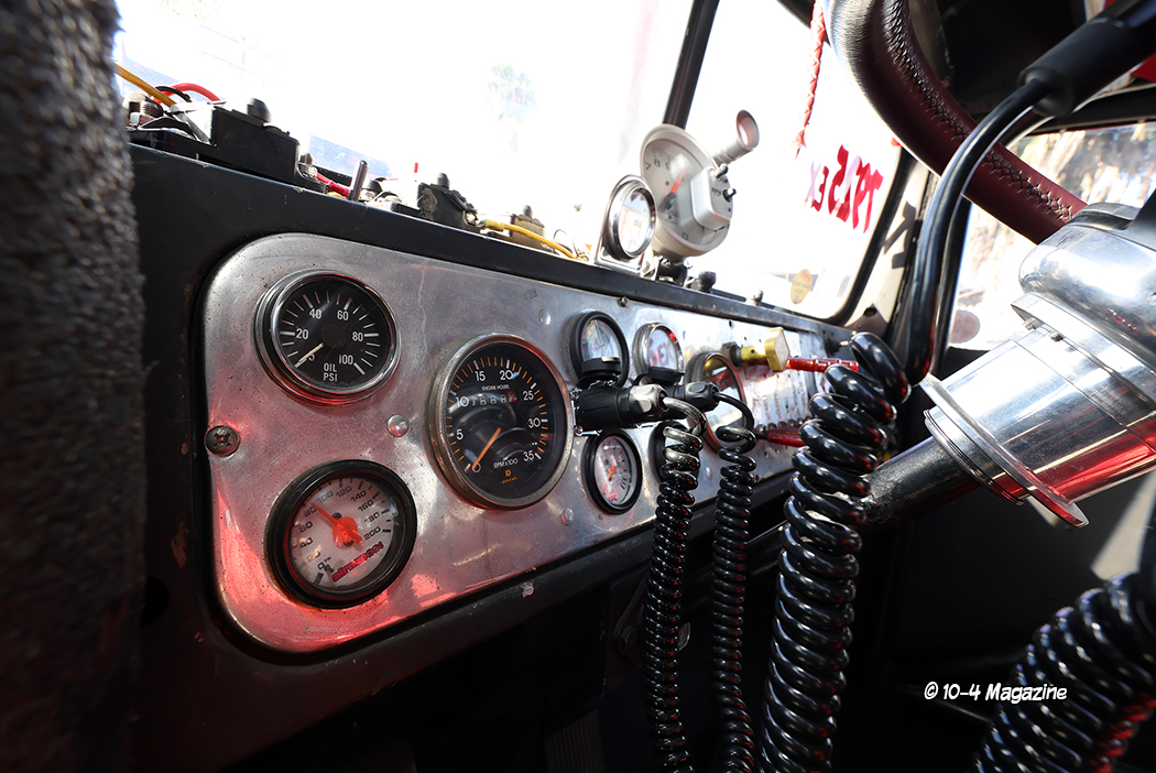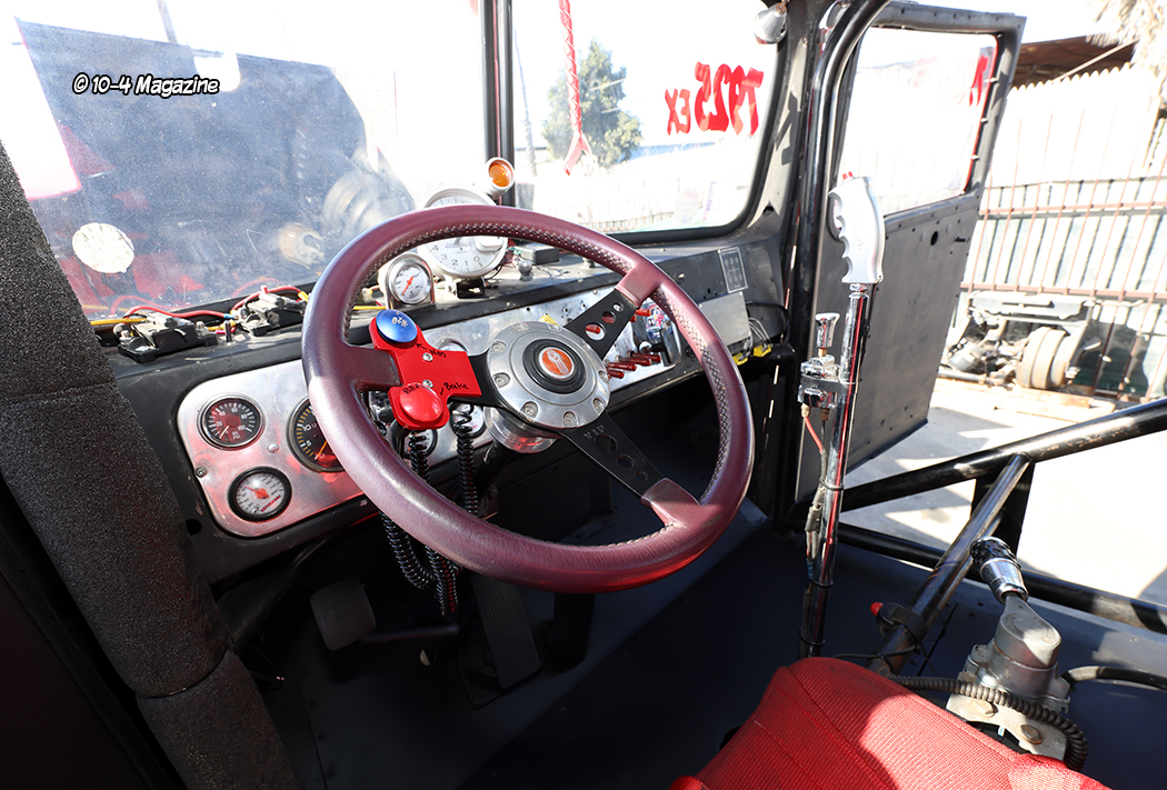 The truck, still based on the original cab and chassis of that 1957 Kenworth 921, has a custom 1,800-hp Cummins Big Cam engine, with the valve covers and intake/exhaust manifolds from an early Cummins N14, along with a 98mm Garrett GTX55 single turbo.  The hood is a rare fiberglass wide hood, made for narrow cab KWs in the 1960s, which they got as salvage, and then had it stretched 14 inches.  There is a notch cut out of the hood to accommodate the exhaust, which goes straight out the top.  On the back, there is polished diamond plate decking, custom slicks that come from Pennsylvania, a polished fuel tank, and the nitrous tank (there are also parachutes on the back, but they are just for show).  The pinstriping and lettering on the truck was done by Justin Klos of Klos Custom Trucks in Australia, and includes “Lokin” on the door, which is Spanish for “Crazy” (Oscar’s nickname).