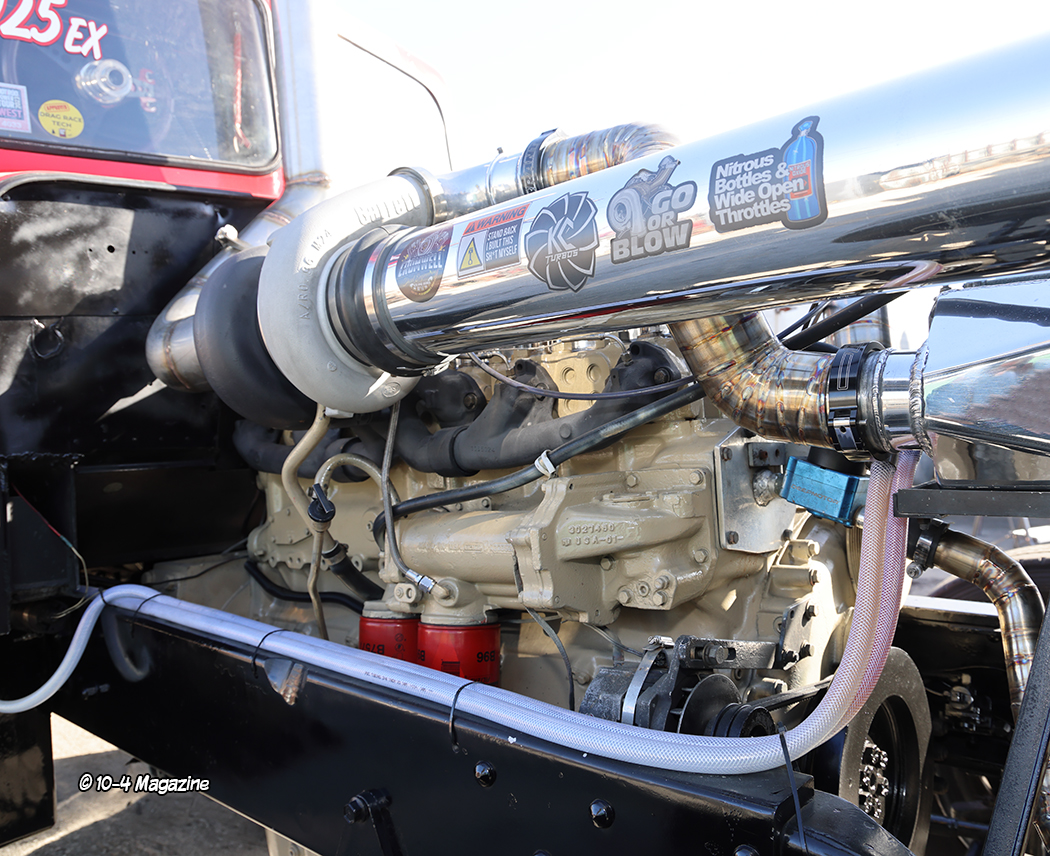 Without giving away too many secrets, the engine has a stock block, crank and rods, and features modified and ceramic-coated pistons, double springs on the high performance heads, a custom cam, high flow injectors, and a turned-up fuel pump.  Power is pushed through a modified manual 10-speed transmission and a custom four-disk clutch to that previously mentioned Positraction rear-end.  There is also a box marked as “Some Apple Juice” mounted behind the cab, which they fill with 60 pounds of ice before each quarter-mile pass.  This ice-cold water is pumped into the intercooler to cool down the air going into the engine.  Nitrous is used as a secondary cooling system for the air, and it also adds some horsepower.  They burn five gallons of Hot Shot’s Secret Diesel Race Fuel on every quarter-mile pass!