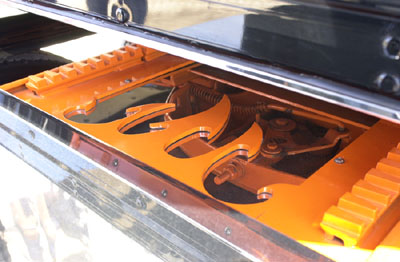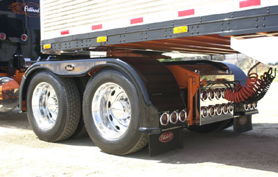 engine, linked to an 18-speed transmission, which sends its power to the 24.5 low-profile wheels through a set of 3:56 rears. Ordered from Rush Peterbilt in Albuquerque, the truck has a 280” wheelbase, a car-hauler front axle, and pulls a 2001 stainless steel 48’ Great Dane spread axle reefer. Vlad ordered the truck with no cab lights and then bought nine lights of his own. After getting the truck, he decided that he didn’t want to cut holes in the roof so he returned the lights and never put any on. He added a visor, 8-inch straight pipes, fiberglass WTI full fenders (on both the truck and trailer), and Double JJ headlights and blinker bars (every fender has a blinker bar). He then had all the exterior door handles shaved off (actually, the door skins were completely replaced), he chopped the screens on the air cleaners and painted them black, removed the hood pull, and added a pair of stainless boxes (not wrapped but completely made out of stainless). To help the truck look lower, Vlad even turned the outside mirrors upside-down to bring them down a few inches. Other exterior details include covering all of the Peterbilt logos with vinyl “Peterod” logos, adding a steel plate under the 5th wheel that is cut into a flame shape and mounted over of a piece of stainless (see photo below), and installing a custom stainless “belly pan” that wraps around and covers the driveline. The trailer features two polished tanks, an orange frame, and a Thermo King “King of the Road” unit. But as good as the
