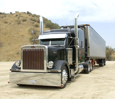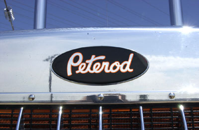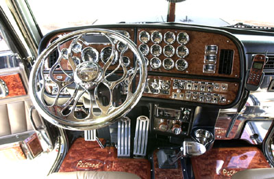 aluminum armrests (which are mounted lower to match the seat height), electric windows, and an amazing stainless steel floor throughout the cab and sleeper, this truck is like a rolling Presidential suite. Rockwood made custom hardwood floor mats with the “Peterod” logo engraved on them. Every interior door and most of the ceiling is covered with stainless steel panels. The sleeper also has a 20” flat screen television and a Sony Play Station II to keep Vlad entertained on those long layovers. This truck has, in our opinion, the most unique and awesome interior we’ve ever seen.