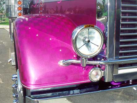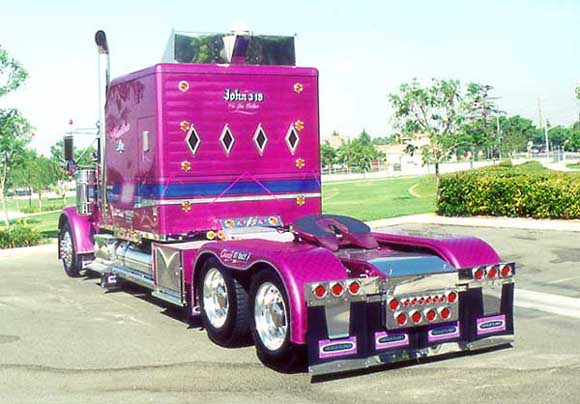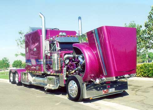 One look at this month’s cover truck and you know it’s a little different. With its flashy paint job, custom headlights and large aftermarket sleeper (not to mention the fact that it’s a Freightliner), this rig is always a sure show winner and a large crowd magnet. And the guy who owns it, built it and drives it is very proud (but humble) of his “Classic” creation. ![]() Through the influence of a past boyfriend, Darian Stephens’ (pronounced Darrin Stevens) mother got involved in the trucking industry in the early 1980s. Darian began driving a truck shortly thereafter. From 1984-1991 Darian drove as a company driver for Carl Betz Trucking out of Orfield, Pennsylvania. Hauling local loads of U.S. Mail and driving a dirt truck, Darian learned the ropes of the road. In 1991 his mother helped him buy his first truck. Really liking its new style of hood (at that time) and wanting to be different, Darian purchased a Freightliner Classic XL. That same year he signed on with National Carriers and has been there ever since. When buying his first truck, Darian revisited his childhood for inspiration regarding color and graphics. When he was a teenager, his mother and her boyfriend had a Pete cabover show truck that Darian was very fond of. When they got rid of the truck, Darian kept a list of the specs. When he ordered that first Freightliner, he had it painted the same color (Orchid Metallic) and spec’d it very similar to the old Pete he loved so much. Four years later, after a few good years, Darian ordered his second Freightliner Classic XL, in the same color (Orchid Metallic), but this time changed the color of the graphics. This second truck, a ‘95 Freightliner Classic XL, is the rig featured on our cover this month. Ordered as a daycab with a 290” wheelbase, the first thing Darian did was take it to Double Eagle and have them install one of their large custom sleepers. From there, he tricked it out very close to what you see today. Over the years, Darian’s truck came to be known as one of the finest around, winning many truck shows throughout the country. But after a few years on the road, Darian knew it was getting time to give it a total make-over. Taking advantage of several weeks off while recuperating from a double hernia operation last summer, Darian began working on his hood and doing some customizing to his headlights. Following the trend of Double JJ’s single round headlights seen on so many Petes today, Darian, with inspiration from the classic Chevy and Ford street rods of yesteryear, designed and built an entirely custom headlight assembly. Lights were purchased at a hot rod shop and a bar that runs across the front of the grille and holds them was fabricated by Greg Schoenly and Mark Harkleroad. After the welding was complete, RT Street Rods chromed the bar. Then there was the tedious process of removing the old headlights. After cutting out the lights from the fenders, the holes were patched and then layer upon layer of fiberglass was applied until the patched holes were completely invisible. After this was completed, it was time to repaint the front end with a fresh coat of Orchid Metallic. Darian decided to add a few “ghost” checkers to the top of the hood. When finished, his truck looked totally different and very cool. A few months later, Darian debuted his “new” front end at a truck show in Terrell, Texas. Winning first place at that show, Darian qualified to compete in the finals of the Stars & Stripes Competition being held at the 2001 Mid America Trucking Show in Louisville. To help increase his chances of winning and do the major restore he was wanting to perform, Darian shut the truck down around Christmastime and worked hard on it for three months, until the Louisville show came around in late March. Taking the truck down to its bare frame rails, Darian started at the foundation and worked his way up from there. The final product, which you see on the cover and these pages now, is even more incredible and cool than ever before. Having got such a positive response from the checkers at the truck show in Texas, Darian decided to add a few more. By the time he was finished, the truck had over 10,000 “ghost” checkers on not only the hood (including the inside) but also on the top of the cowl, the front brake drums, the CB antenna bases, the inside of the door jambs, on the driveshafts, on the new fiberglass full fenders in the rear, the back of the tool boxes and the inside of the tool box doors, just to name some of the places. Darian did almost all the taping himself, with help and guidance from Mark Hollon at Denver Truck Painting in Denver, Pennsylvania. He admittedly went a little crazy, but the checkers are so light that sometimes you can’t even see them (depending on the lighting). Mark also sprayed the new stripes and graphics using Light and Dark Violet Metallic, Pink Panther, Continental Blue, Dark Surgeon Blue and Silver, then outlined everything with Basic Black. Thanks to the several finishing coats of clear that were applied, the colors look especially “deep” and vivid. While painting the truck, one of Darian’s doors was accidentally dropped, causing a bad gouge in the window tint. Trying to make the best of a bad situation, Darian started thinking about how he could “improve” upon the idea of windows tinted with film. He decided to replace not only the side windows but the windshield with “bus glass” which has a light blue factory tint on the top few inches. Darian had the glass cut and installed so that the tinted portion was on the bottom of the windows. Darian says it not only looks cool but helps knock down the glare coming off his always clean hood. All of the “shiny” pieces were either replaced or redone. All ten of the aluminum wheels were polished (inside and out), the tanks were polished all the way around, the bottom of the boxes were polished and a custom deck plate that hinges open like a tra