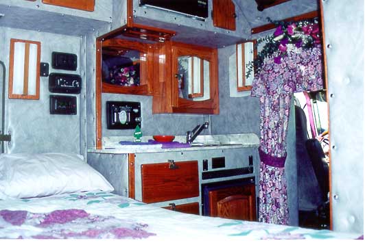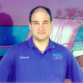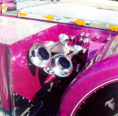 As nice as the interior and exterior of Darian’s truck is, where he really scores the big points at the shows (and with fellow truckers) is under the hood. The truck came with a stock factory Detroit Series 60 which had 470 horsepower and 1550# of torque. Darian upgraded the old motor to 500 horsepower and 1650# torque - just to make sure he had enough juice for those long grades. The engine, which is coupled to a 15-speed overdrive transmission and 3:58 Rockwell rears, is painted Dark Violet to match the truck’s exterior and is covered with chrome. Here is a partial list of some of the chrome and stainless pieces under the hood: valve cover, rocker cover, twin alternators, all water and oil tubes, oil pan, flywheel housing, fan hub, water pump, oil cooler, starter, air compressor, steering arms, tie rod ends, drag links, brake chambers, spider housings and all of the access plates on the bottom side of the transmission. Stainless steel loops were added around the driveshafts to keep the grease from splattering. This beautiful engine is truly spectacular (see it in a full color inset photo on the centerfold). Everyone thinks the truck is named “Keystone J.R.” but in reality it doesn’t have a name. Keystone J.R. is Darian’s nickname that evolved over the years. When he was a kid, everybody called him Junior, which later turned into J.R. When he began driving with National, there were lots of other J.R.s - Kansas J.R., Arkansas J.R., etc. Being that Darian was from Pennsylvania (the