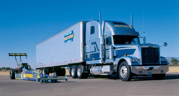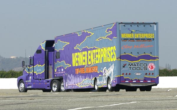 It would be hard to miss all those light blue Werner fleet trucks out there on the road, but there is one, that looks a little different, that you may not have seen. It’s the transporter for Werner’s top fuel dragster. Racing team owner Peter Lehman assemled a group of