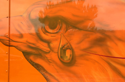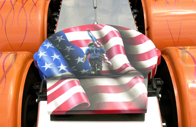 waving American flag as a backdrop. Portraits of President George W. Bush and former New York Mayor Rudolph Giuliani flank the lower corners of the mural, along with a painted-on plaque that says God Bless America. Each side of the sleeper has a profile of an eagle with a tear in its eye - within the teardrop is an image of the towers burning. They also have a painted fifth wheel cover that features a firefighter walking away, holding a rolled up flag over his shoulder, with a waving flag backdrop. Looking at these images conjured up deep emotions about what we remembered from that fateful day last September.