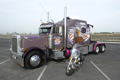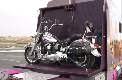 T.J. had a simple desire - to bring his beloved 1999 Heritage Softail Classic motorcycle with him on the road - but he had trouble finding someone to help him. He went to three welders before finding one that was willing to build him a boom and winch to pick up his 800-pound bike and set it down on a rack behind his sleeper. The first two said they could build it but they didn’t want to (they were afraid of possible liabilities). Built by Preferred Welding in Unadilla, GA, the unit is basically a heavy duty “L” shaped rack, with a diamond plate platform and a boom mounted in one of the corners. The boom has a 4” outer pipe (1/2” thick) which is welded to the back and side of the rack and goes all the way down through the floor, where it is secured to the frame. Inside that tube is a 3-1/2” pipe that goes all the way down. The winch is operated by a button on the side of the rack. The completed rack, platform and boom were then painted Hawaiian Orchid to match the frame and front fenders.
