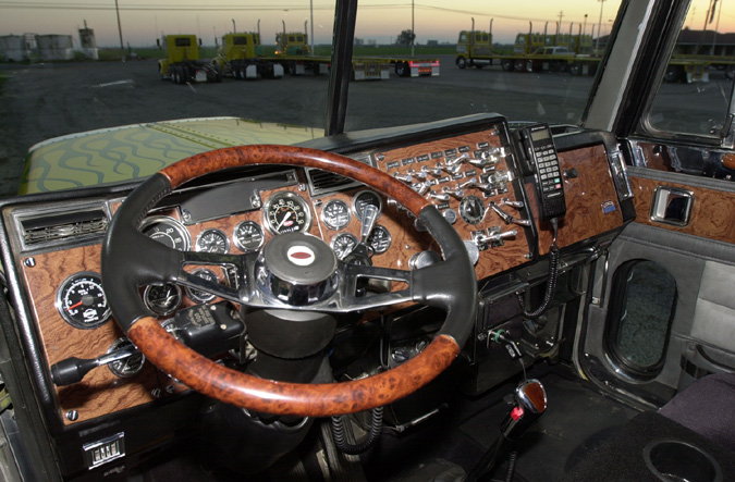 aluminum switches, a custom wood steering wheel, low-rider seats, and five green