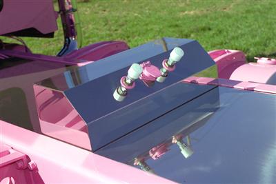 The entire frame and undercarriage was painted pink. Bob says the pink paint on the inside of the frame rails is just as perfect as the paint on the outside of his fiberglass full fenders. Universal sprayed the magenta first, then the pink, and then clear coated the entire truck. The air horns were removed from the roof and extra bus lights were added atop the truck’s cab.