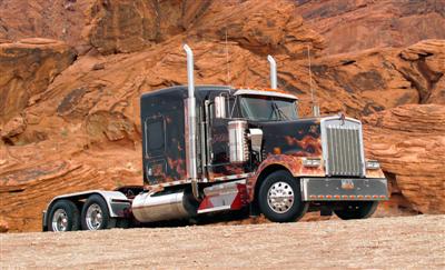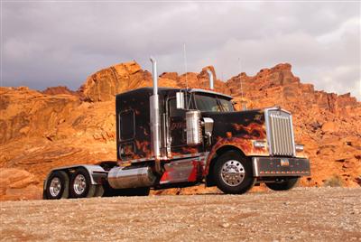 The truck is a 2002 Kenworth W900L with a 72-inch flat top AeroCab sleeper, a Cat C-16 with 600 HP, an 18-speed transmission, 3.70 rears, a Jake brake and a hydraulic retarder. This thing purred like a kitten but roared like a lion! Even while pulling a fully-loaded reefer trailer, the truck was blowing by four-wheelers as it climbed the grade up out of the Las Vegas Valley toward the State Park. Covered with LED lights and plenty of chrome, the truck (like all of Peck’s trucks) features a specially-ordered red frame, red interior and a one-piece, lightweight, plastic front end. But what really sets this rig apart from the rest is its cool paint job.