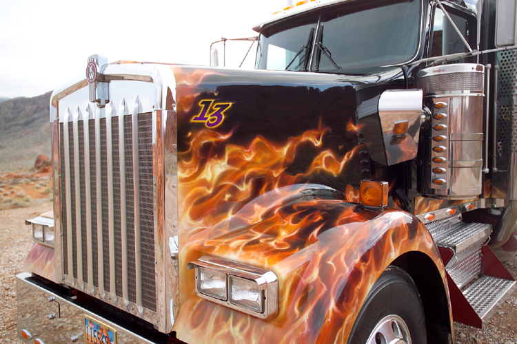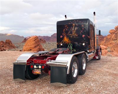 Tom wanted to do something different, so he hired airbrush artist Mike Lavallee to do what he does best - paint realistic-looking flames. After Gary and Lisa Jensen did all of the prep work, Mike, owner of Killerpaint Airbrush Studio in Snohomish, Washington, flew down to Utah and spent two days on the truck. He not only sprayed all of the “fire” but also painted a mural of a beautiful Indian Maiden on the back of the sleeper. Mike’s innovative “TRU-FIRE” technique is taking the custom world to the next level. He has painted several motorcycles and cars with this type of mural, as well as a helicopter. His unique work has been featured on Discovery Channel’s Monster Garage and he also does a lot of work for Jesse James, owner of the now-famous West Coast Choppers.
