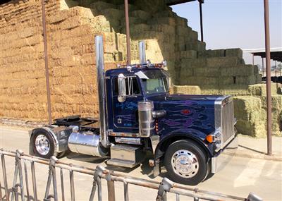 Today, Joe operates a fleet of eight trucks with a variety of different types of trailers and configurations - but all are based around manure. His company cleans out corrals with scrapers and loaders and hauls away the manure, taking it out to the fields in Hemet. In the old days, they used to clean out the dairies for free, and then sell the manure for profit. But now, with many farmers using liquid fertilizers and man-made chemicals, the market for manure has dropped so badly that Joe has to pay a small fee to dump his loads of cow crap. Obviously, he can’t clean the corrals for free anymore, so he now charges the dairyman a hefty fee for the cleaning. He has one transfer unit, five tractors that pull double side dumps, two truck and trailer side dump units and one truck pulling an end dump. The makes of the trucks in his fleet include Kenworth and Freightliner, but most of Joe’s trucks are Peterbilts - with the most impressive one being the cool 2-axle featured on our cover this month.