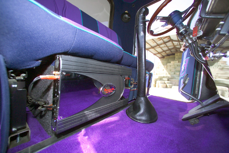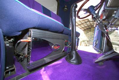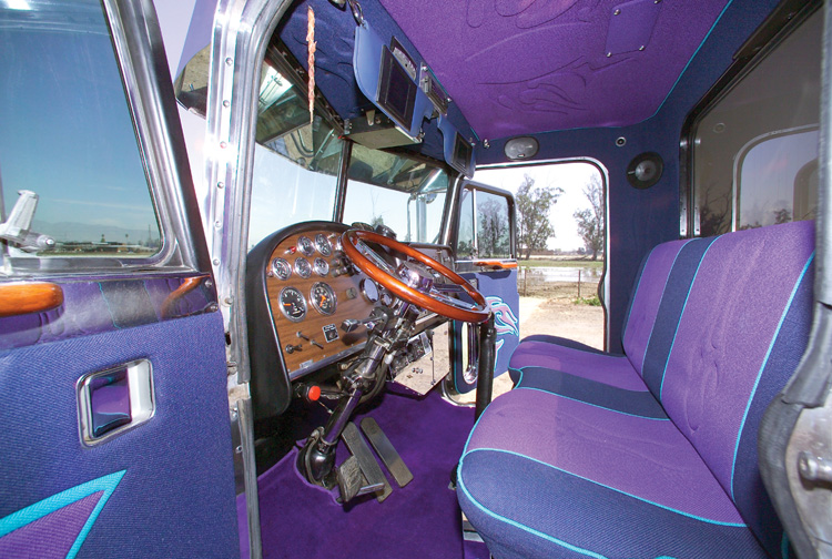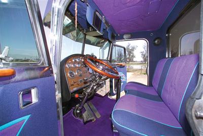 Besides the awesome paint, the massive 8-inch straight pipes and all the custom stainless made by Fred Viramontes, what really stands out on this truck is the interior. Joe went all out and had Lil’ J’s in Riverside completely redo his interior with custom upholstery and state-of-the-art electronics. On the back of the sleeper, there is a tribal flame graphic which Lil’ J’s emulated inside the cab as often as possible. The graphic’s shape and colors were embossed or stitched into the door panels, headliner and on the seat. A custom bench seat was built to house and hide much of the electronics, including two, twelve-inch JL Audio subwoofers. Mounted on the front of the bench seat (behind your legs) are two huge chrome amplifiers. An American Pro Bass Machine, pumping out 2,000 watts, powers the subwoofers, and a 700 watt DHD Power Cruiser runs the mids and the highs through six other speakers. Tunes come via a Kenwood stereo and 10-disk CD changer. But that is not all of it. The truck also has a full Panasonic DVD system, complete with two seven-inch monitors mounted on the backside of the fold-down sun visors. The interior was done in colors to match the exterior’s paint scheme - namely purple, light blue and dark blue. As great as it looks outside, the inside is what really makes this truck a stand-out rig.