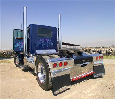 Joe purchased the 1987 Pete 359, equipped with a 400 Cummins and a 13-speed transmission, from Golden Bear Trucking, an outfit that hauls gasoline and is known for their clean rigs. Back then, the 3-axle tractor had Golden Bear’s brown and black paint scheme, which Joe did not change at first. After a few years of pulling a set of bottom dumps, Joe decided to cut off the rear axle, install a wet kit, and start using it to pull double side dumps, like most of his other trucks. Two years ago, Joe realized it was time to repaint, so he had the truck sprayed Pearl Blue. After that, he started adding some chrome - not much at first, but you know how these things go. One year ago he decided to take the truck to the next level and added multi-colored and marbled tribal flames. To achieve the marble look, painter Van Devort of Fontana, CA applied plastic wrap over the just-painted, still wet flames. After a few minutes, the plastic wrap was removed and the marble-look was left behind. A few coats of clear were added to protect the finished product. Joe added some more chrome and started gunning for the cover of 10-4.