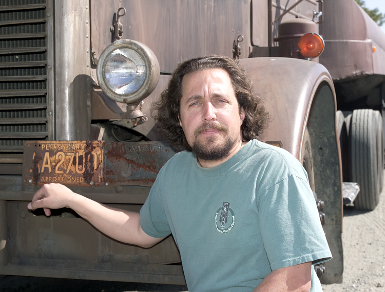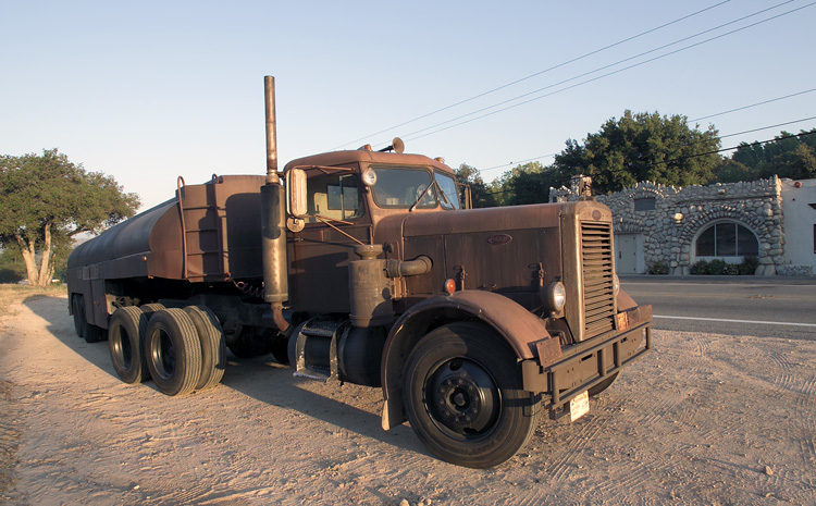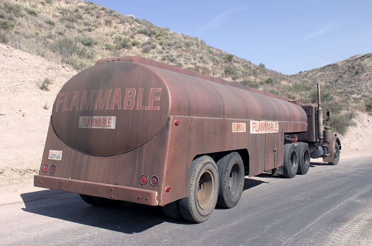 For the movie, the truck was actually coated with oil and dirt to give it that nasty old look, but that is not practical for long term use. One of Neil’s friends, who specializes in scenery painting for television and the movies, gave the rig and brand new “old” paint job. Yes, this truck now has a fresh, new, permanent paint job that replicates (as close as possible) the look the truck had in the movie. Using “aging” techniques, they regularly touch up any spots that start to shine or look too good – can’t have that! This is the only photo shoot we ever did where the owner was actually throwing dirt on his truck’s wheels because they were too shiny. The 32’ tanker trailer was also purchased from Oil Transport, but not much else is known about it (the original title was lost years ago).