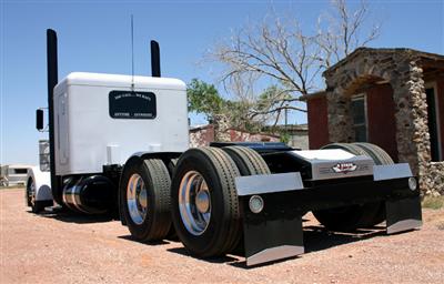 In keeping with the “no shine” theme, all of the bright aluminum was sanded and scuffed (not everyone can say they detail their truck with a scotch-brite pad) and powder-coated black 8-inch stacks were bolted on. As an afterthought, they added grass-burner exhaust out the bottom of the truck. In fact, the upright stacks are just for show. The grass-burner pipes are the actual exhaust - which is a killer on dusty, dirty parking lots!