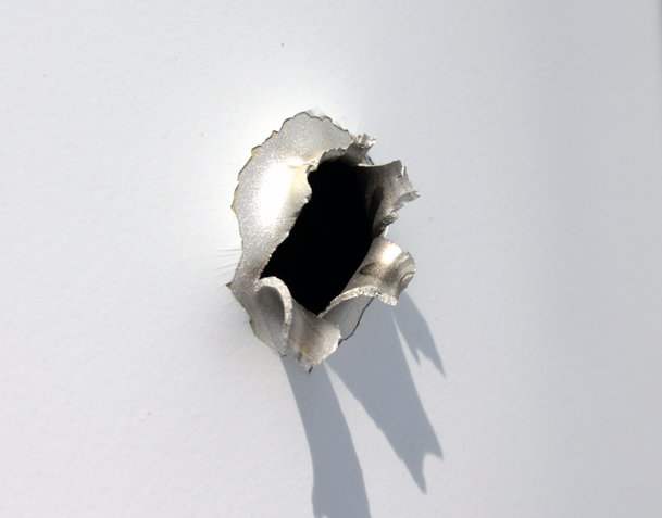 Someone got the bright idea to riddle the right side with real bullet holes. It didn’t take Bryan long to jump on that bandwagon. At this point, the truck was basically finished, so they removed the pieces to be shot (like the air cleaner, fuel tank, passenger-side door, and outer skin of the sleeper) and Bryan took them out back and fired away with a Chinese .762 military rifle. Bryan said it was quite a rush to blast holes through a perfectly good show truck. Afterwards, caps were welded or glued behind all of the holes to avoid dirt and water from getting inside. Even the fuel tank, which has a big jagged hole in its side, was opened up and repaired from the inside so it could still be used. Pretty cool!