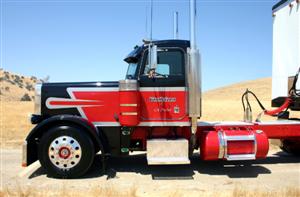 In November of 2003, Kyle ordered a brand new 2004 Peterbilt 379 in black with a red frame. Wanting some good power, but not wanting to pay too much, he opted for the Cat C-15 engine with a twin turbo and 475 horsepower, 3.55 rears and a 252-inch wheelbase. After taking delivery in April of 2004, he had the guys at Golden State Peterbilt add the red and silver paint, as well as ghost flames on the front fenders.