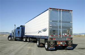a 48-foot Utility spread-axle reefer. The trailer is white with blue and