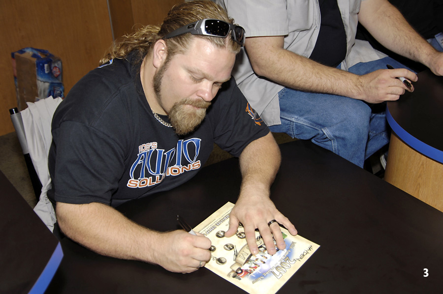 The “boyz” from the Chrome Shop Mafia were always on the run and always had a crowd around them wherever they went. All three days you could find some (or all) of them signing autographs somewhere – in the Sirius Satellite booth, the Midnight Trucking Radio Network booth, the Michelin booth, the Exxon/Mobil booth and others, including their own in the Broadbent Arena. Adoring fans waited in line for hours to say “hello” and get an autograph (photo 3). In addition to running their own businesses and staring in the television series “Trick My Truck,” the CSM guys also build special trucks for giveaways. One such truck was a 2002 Freightliner Classic XL that was totally transformed by the boyz and then given away at the show (in a random drawing). Sponsored by Great American Insurance, the lucky winner was Bruce Doering of Janesville, Wisconsin. Another project that will be keeping them busy is the Castrol Big Honkin’ Truck Makeover. This year’s winner, Kevin Greene of Cincinnati, Ohio, will receive a $50,000 makeover performed by the Chrome Shop Mafia on his Pete 379, courtesy of Castrol Tection Extra. Oddly enough, Kevin and his red Pete were featured back in our January 2006 “Readers & Their Rigs” column. Congratulations Kevin – we can’t wait to see how it turns out. The truck will be unveiled at the Great American Trucking Show (GATS) in Dallas this August.