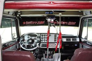 Buck has been buying parts from 4-State Trucks, now the home of the Chrome Shop Mafia, since they were just a junk yard. While the truck was at the shop, Buck stayed close and tried to be part of whatever they were doing. The guys at 4-State built Buck a set of custom hidden brackets so that he could mount his stainless half fenders rolled forward chopper-style, and also made custom brackets to mount an 18” bumper on the back as a light bar. They also added a small 50’s-style oval window to the back of the sleeper, mounted short 10” pipes and installed a Valley Chrome bumper with a 12 Ga. flip kit. Most of the other work 4-State did was inside – they painted the floor and the dash, changed out all of his gauges and then converted his regular transmission into a simulated “two stick” (10+2) and made extra long rat-rod shifters (the second stick is for his splitter).