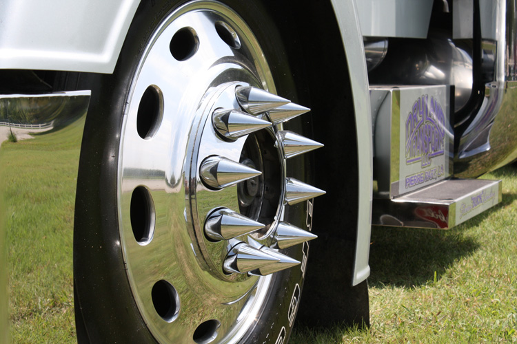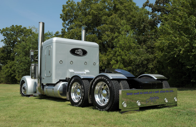 In late 2006, his dream finally came true. Buck found and bought a stock 2004 Peterbilt 379 with a low-leaf suspension, a 475 Cat and a 48” flat top sleeper. At first, he couldn’t afford to make any expensive changes or shut down long enough for someone else to do them, so he started with the stuff he could do by himself in his spare time. Since everyone was building long and sleek trucks, Buck decided to build his short and fat, and give it a “heavy duty” look. He began by pulling the blocks to lower the front end and then he painted his grille surround, added cab and sleeper extensions, shaved the blinkers off his headlights and painted the buckets, added a louvered grille and installed fiberglass Jones Performance front fenders. He also shaved the cab lights and horns from the roof of the cab. To save some time and money, Buck had his tanks wrapped in metallic silver vinyl instead of painting them and, quite honestly, we couldn’t even tell. After he had done everything he could, he took it to 4-State Trucks in Joplin, MO for more.