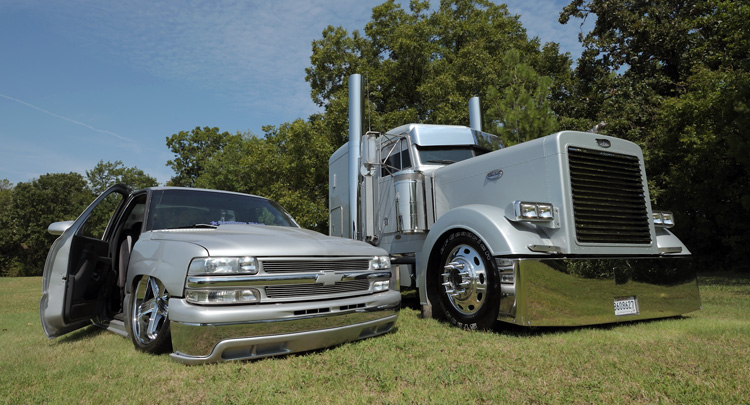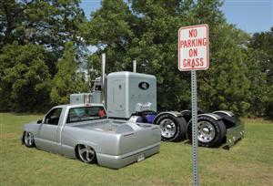 As you can see in the pictures, Buck has a slammed pickup painted to match the big truck. Buck has had a couple custom pickups over the years, but this latest one, which has been an eight-year project, is pretty extreme. He bought the 2000 Chevrolet Silverado new and almost immediately wrecked it. At that point, he painted it silver and started working on it. Today, it has a stainless steel 4-link suspension, suicide doors with shaved handles, shaved taillights and 23” wheels. Buck C-notched the frame 12” around the rear suspension and raised the floor of the bed and the cab so that he could drop the truck to the ground. He even had to add a hood scoop to accommodate the engine when the truck is dropped. He actually has enough space in his wheel wells for 26” wheels, but for now he is sticking to the more practical 23 inchers.