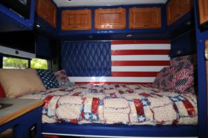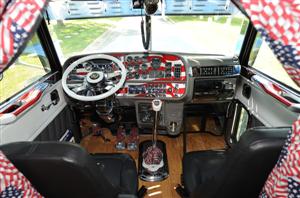 In August of 2007, the truck went to ICT in Indiana for a complete interior renovation. They began by tearing the entire guts of the sleeper out, taking it all the way back to just bare walls, and then revamping everything from there. A sink was installed, as well as wood cabinets, a flat screen television, an entertainment center, and a new bed, complete with a quilt that was handmade by the ladies at ICT. An American flag, crafted out of pieces of red, white and blue leather, were stitched together to create a unique “patriotic” back wall. They also installed a wood floor in both the cab and sleeper, but they were not finished yet. They also installed a set of WTI double-hump fiberglass fenders and a stainless steel deck plate. The truck was really looking awesome, but, as his “luck” would have it, there was yet another incident.