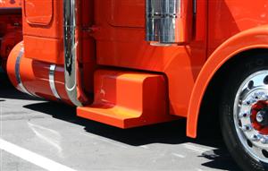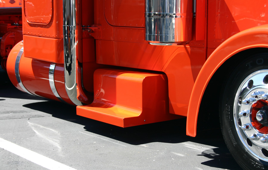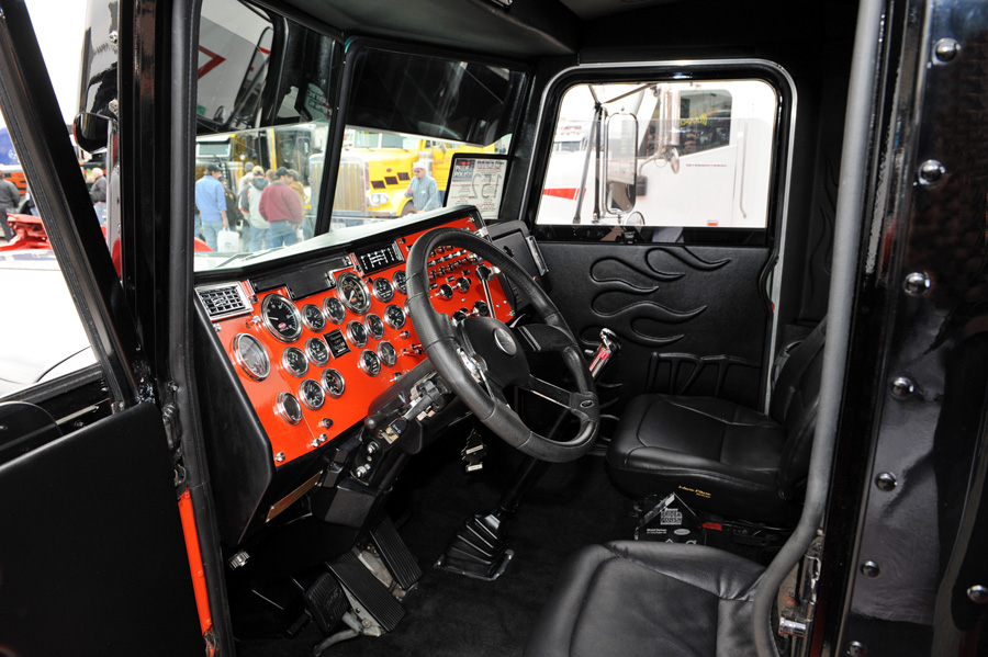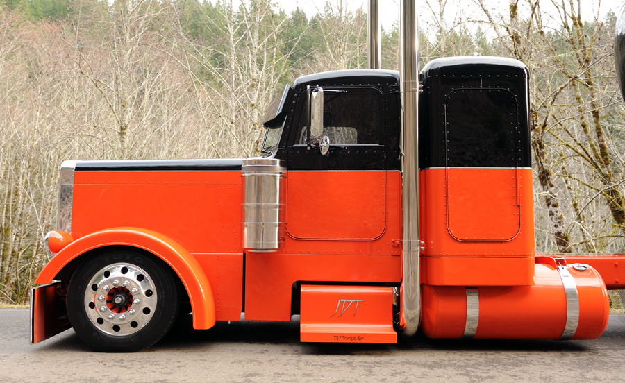 Trevor Luebbert of Kaufman’s Sheet Metal in Tangent, Oregon helped James create custom step boxes with rounded edges, 9-inch cab and sleeper extensions, blank air cleaner panels, deck plates and more. The stock headlights were replaced with 359 double-rounds, which were mounted as low as possible on stock Pete 359 brackets. To clean up the front even more, fiberglass fenders were installed, the fender brackets were removed and the grille surround was extended down to fill in a gap. The cool paint was the final touch. Austen’s Body Shop in Canby, Oregon sprayed the two-color scheme orange on the bottom and black on the top, and then a thin silver leaf accent stripe was added between the two. James then painted most of the exterior features either orange or black.