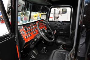 The truck, as mentioned before, is a 1993 Pete 379 Ext. Hood with a turned-up 3406C 425 Cat, a 13-speed tranny, 268-inch wheelbase and 3.70 rears (which are going to be switched out with 3.42’s in the very near future). James is a stickler for perfection – he wanted everything to line up and work together, so he worked very hard to accomplish that look. To get it low, he installed a car hauler front axle and did some heavy modifications to the rear suspension and air bags. He removed the standup sleeper and replaced it with an “old school” 36-inch flattop and then “suicided” the large side doors on the sleeper and added a rear window. James also shaved all the door handles and vents and then reskinned the cab doors. Now, his vision was really beginning to come together.
