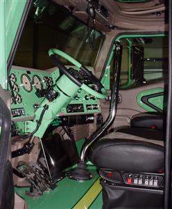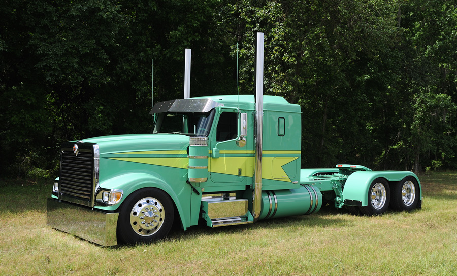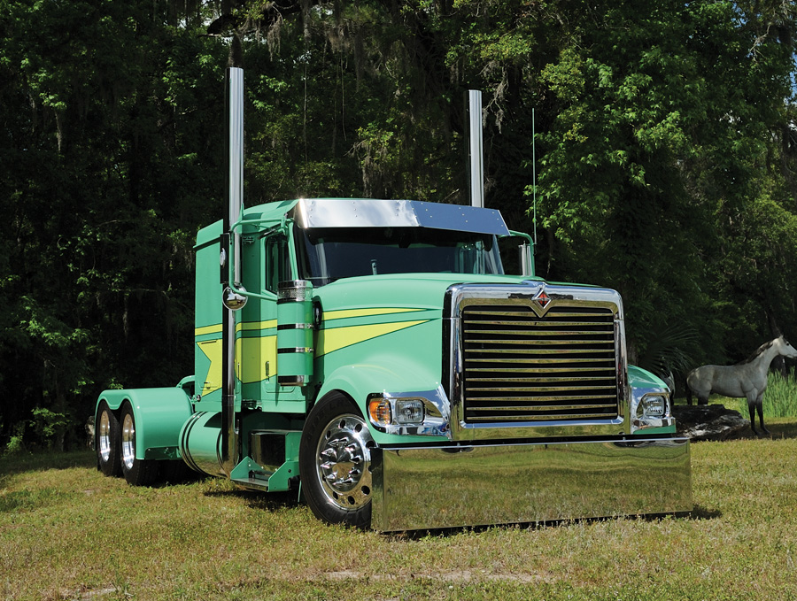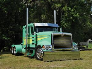 Next, it was time to install the accessories and the other final touches. Vortox supplied their football-shaped air cleaners (these are needed because the hood and cab are wider than most trucks), while WTI supplied the rear fiberglass full fenders. Valley Chrome provided the front and rear bumpers, Panelite supplied the flush-mount deck plates and Trux built the visor. Centramatic balancers were added all around to keep the 24.5 low profile wheels and tires continuously balanced, and a custom grille insert was added. Then, the entire truck was repainted green and the fire-engine-yellow stripes were added.
