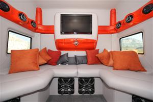 While all of this exterior work was being done, the interior was getting made over as well. The bed, closet and cabinets were removed and replaced with a custom wrap-around couch. The coat closet on the back wall was modified to hold a 37-inch flat panel television. The front seats were ordered with the ability to swivel around, which converts the entire cab and sleeper space into one large living (and relaxing) area. The guys at ETC did a lot of custom fiberglass and paint work inside to accommodate all of the speakers that were installed and to create a comfortable, contemporary interior. The sound system features a Kenwood head unit and 14 Kicker speakers, including four subwoofers, and pumps out an amazing 6,000 watts of power. All that was left to do now was name the truck. With so many different people involved, Anthony thought that the name “Mayhem” would fit perfectly. And, quite honestly, looking at the paint scheme and all of the other custom details on this truck, “Mayhem” describes it perfectly.