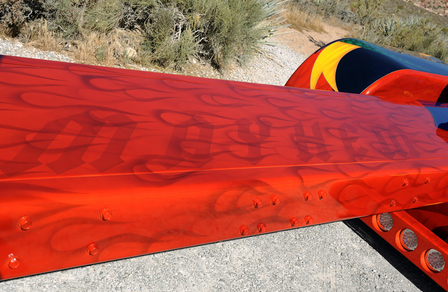 Once the major fabrication was complete, it was time to focus on the smaller details and prepare the truck for paint. Jason suggested that they paint the truck to match Jim’s custom chopper built by Tony Cenzi of Cenzi Custom Cycles. House of Kolor was kind enough to donate most of the paint for the project, and Jim sent Tony to ETC to do the work. Approximately 400 hours were spent on the paint alone, which includes several exotic colors and ghost flames throughout. The grille, visor and mirrors were painted, as well as the front bumper, and the brackets for the mirrors were cut down so they wouldn’t stick out so far. Fiberglass fenders made by Cool Components were installed over the drive tires, virtually invisible single-diode LED lights with clear lenses were placed throughout the cab and sleeper, and high-intensity headlights were fitted into the front fenders.