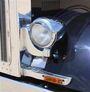 Once the hood was complete, he continued to work up front. Purchasing a set of original headlights from a 1939 Chevy at an old car swap meet, Yoki mounted them on handmade Double JJ look-a-like brackets. He liked the look of the Double JJ brackets, but he wanted his to bend a little different, so he took the factory brackets and, using flat sheets of aluminum, fabricated new brackets around the original ones. The end result looks like a piece of cast or billet aluminum, but they are actually hollow. He then cut and modified his factory fender brackets and fitted them with blinkers (which are lights off a 1973 Volkswagen) and then added an 18” bumper, custom fiberglass fenders with an extra large lip around the edge, a couple extra grille bars and a custom visor. He also removed the horns from the roof and added two extra cab lights.