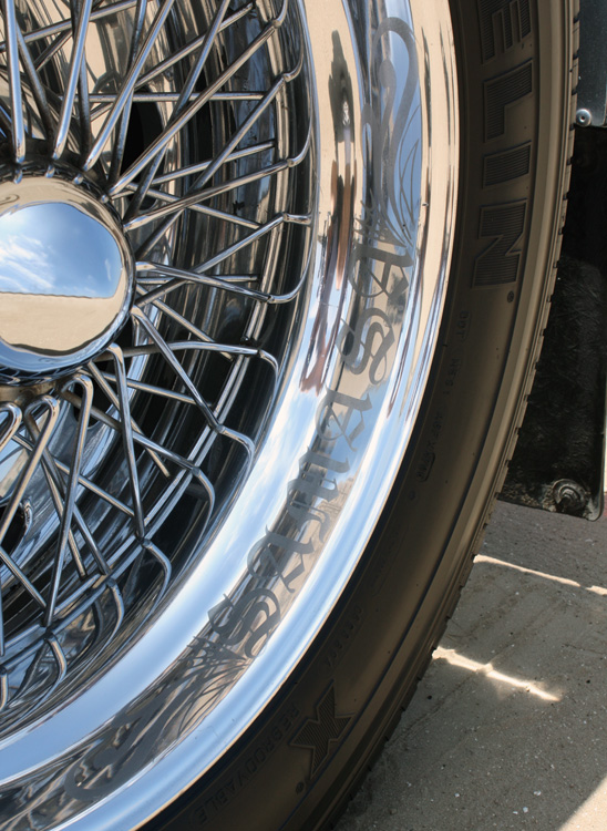 Moving to the back of the truck, you’ll find ghost flames painted on his frame rails, as well as a polished Merritt headache rack, rear-mounted train horns, bullet-style taillights from a 1959 Cadillac mounted to a modified rear light bar and engraved rims. Yoki carefully sandblasted “SAMASA” and “SANCHEZ” into each of his rear aluminum wheels, which are also fitted with wire wheel inserts. Under the hood, every aluminum piece has been polished, and many parts have been chrome plated or painted. Alfonso helped Yoki air bag the entire truck, and fabricated all of the brackets. These brackets, as well as all of the brake chambers and the driveshaft, have been chrome plated. Yoki also notched out the inside of the frame rails near the rear axles to allow the truck to drop a little lower when the air is released (that’s an old trick from the lowriders and the hot rodders). The interior features a custom floor console for his CB radio and stereo,