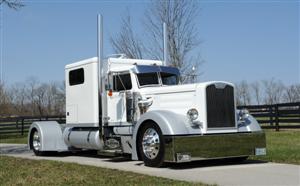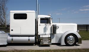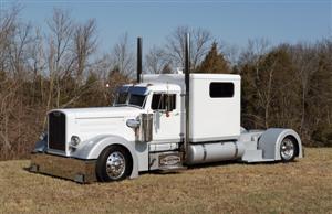 Painted Pearl White with Sirius White fenders and accents, Big John’s exterior includes fiberglass fenders from Cool Truck Components, five-inch straight pipes, single round headlights, dual Vortox air cleaners, smooth stainless steel boxes, LED load lights on the back of the sleeper and a billet grille. The fuel and air tanks were painted, as was the cab and sleeper extensions and the headlight pedestals. Under the hood looks good, too, but this Cat C-12 is not just another pretty face. The six-speed Allison automatic transmission, hooked to a 2.93 ratio rear end, shifts into sixth gear at around 90 mph and the rpm’s drop to about 500, meaning Big John still has a lot of muscle left to flex from there.