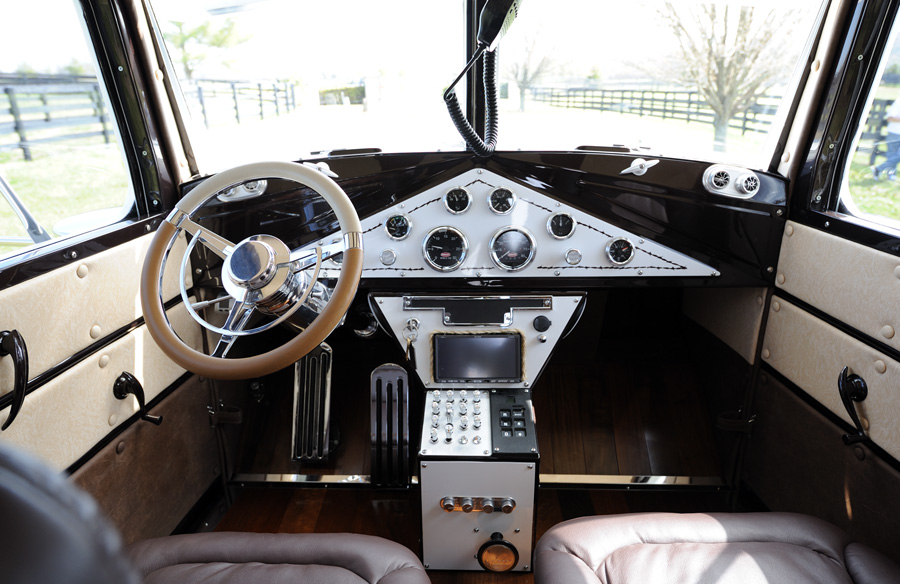 But they didn’t stop at the exterior – the interior is incredible, too. Double Eagle built Big John a custom 70-inch sleeper that features a flat-screen television, side windows, a couch and lounger, refrigerator, wood floor, a sunroof and a rear entry door for easy access. The inside of the cab is fitted with a custom interior that includes a painted dash (black and white with barbed wire trim) with new black-faced gauges, a unique center console, two-tone door panels, leather seats, a billet steering column, a navigation system with GPS, tilt-out windshields (“old school” air conditioning) and tinted glass.