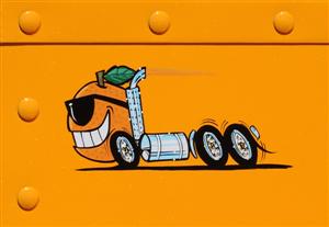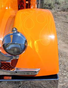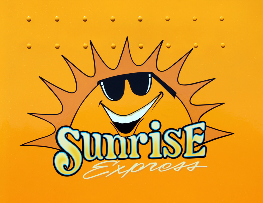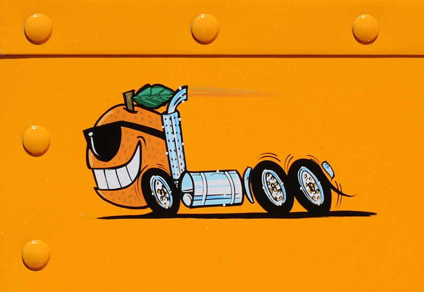 After repairing everything that was broken, bent or smashed in the accident, Ron decided to go with a more exotic paint job. Mike Henry of Henry’s Rods & Restorations in Mesa, Arizona came up with the unique Tangelo Orange fading up to Wheatland Yellow paint scheme to emulate the look of a sunrise. From there, the new name “Sunrise Express” just came naturally. The painter who designed Ron’s logo took elements of Ron (like the Ray-Ban sunglasses he always wears, his big smile and his bald head) and incorporated them into the fun design. Ron says that this smiling sun logo exemplifies his “fun side” while a smaller logo on the side of his hood (a speeding tangerine, with wheels and stacks, and also wearing sunglasses) depicts the side of him that just wants to “get the job done” – and this little tangerine seems to have a bad attitude.